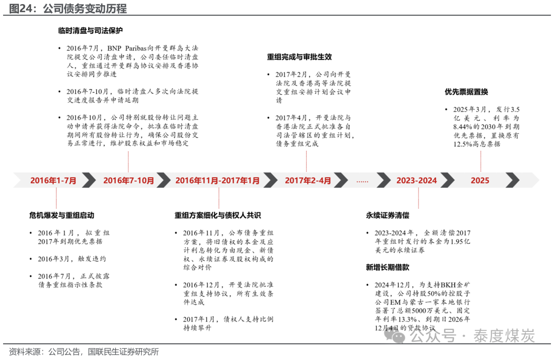 2016年1月-7月:行业下行、公司现款流承压触发债务违约。2014年起,全球大量商品进入下行周期,焦煤价钱剧烈波动,导致公司现款流承压。债务违约前,公司核心负借主要由6亿好意思元于2017年到期的8.875%优先单子以及多项银团贷款(包括BNP Paribas、ICBC 等)组成。2016年3月,公司未能按期支付单子利息,矜重触发违约事件,并接踵激勉了其他银行贷款合同下的交叉违约条目。