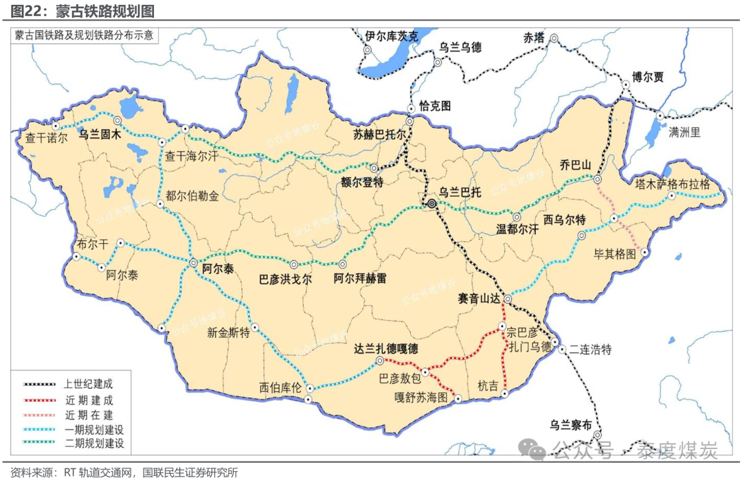 昔时铁路输送在蒙古煤炭出口中占据的份额有望抓续提高。蒙古于2022年完成了两条主要铁路的建设,TT-GS铁路于2022年9月9日通车,宗巴彦-杭吉铁路于2022年11月25日通车。2024年4月,中蒙两国签署合同,建设噶顺苏海图-甘其毛王人(GS-GM)跨境铁路,该铁路全长8081米,接收UIC60钢轨,包括一条宽轨(1520毫米)和一条尺度轨(1435毫米),并配有一座5441米长的桥梁。铁路建成通车后,年货运身手可达3000万吨,并承担蒙古55%-60%的煤炭出口,瞻望将进一步加多蒙古对中国的煤炭出口量。GS-GM跨境铁路技俩已于2025年5月14日矜重开工,建设周期22个月,瞻望2027年3月投运。