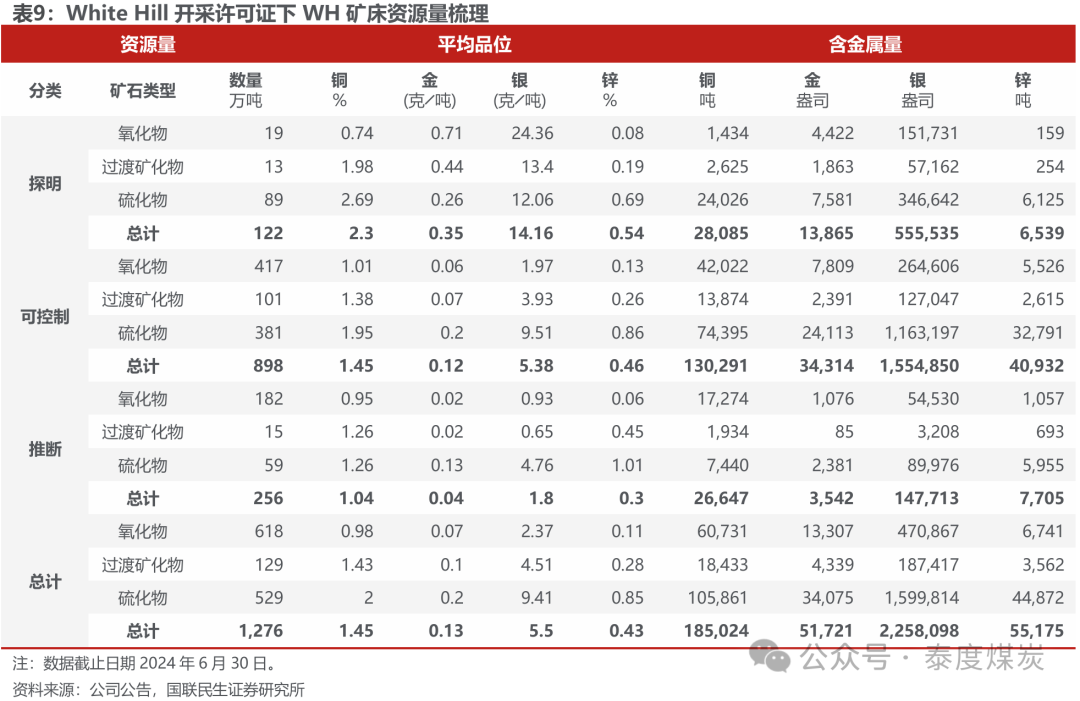 WH矿床资源量丰富,后劲较大。White Hill矿床是含有铜、金、银、锌的多金属矿床,其资源总量包含约18.5 万吨铜和5.2万盎司黄金,昔时开辟后劲较大。
