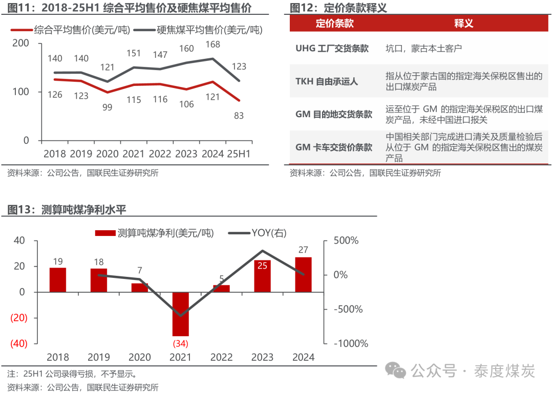 Ø 煤炭为基:蒙古焦煤龙头,成本上风显耀。公司煤炭资源量9.16亿吨,储量6.12亿吨,领有UHG和BN两个在产焦煤矿,散播于全球著名的TT煤田,其煤质与中国主流矿区疏淡。1)产销:公司原煤产量2023年以来显然增长,2025年受煤价影响收尾1467万吨,同比-10.2%。公司加大焦煤洗选,2025年洗出率提高至58.4%,洗选焦煤销量822万吨,同比+4.3%。2)售价:公司煤炭家具订价追随中国国内但存在滞后反应,昔时跟随MSE竞价销售比重提高,或将渐渐向现货价钱逼近。2025年煤价同比下滑,2026年在中国供给收缩力度加强及常态化监管下,核心有望上移。3)成本:频年吨煤成本受洗选率提高影响核心上移,25H1为68好意思元/吨,同比-10.6%。结构中波动较大的为输送成本短途段,待GS-GM跨境铁路于2027年通车后,公司单元输送成本有望从15.2好意思元降至8好意思元,可增重利润约0.6亿好意思元。4)盈利:2024年吨煤净利约27好意思元/吨。