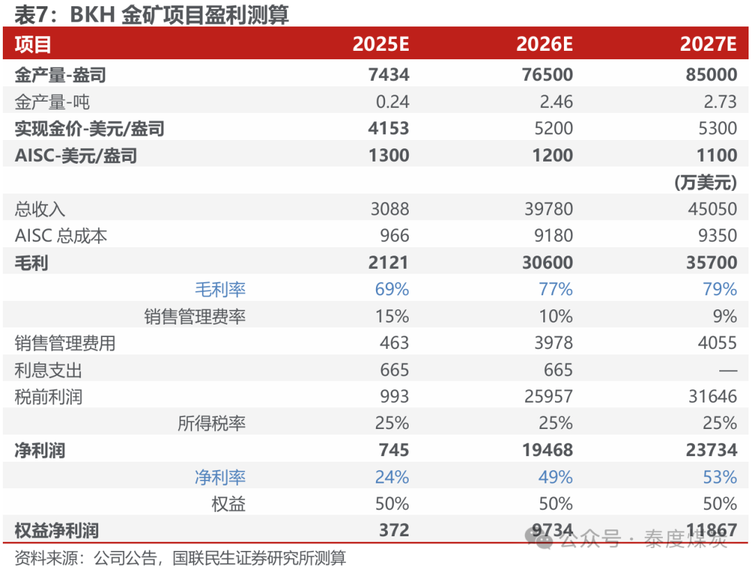 BKH金矿技俩2026年有望孝顺0.97亿好意思元归母净利润。咱们对BKH金矿2025-2027年盈利进行测算,要害假定如下: