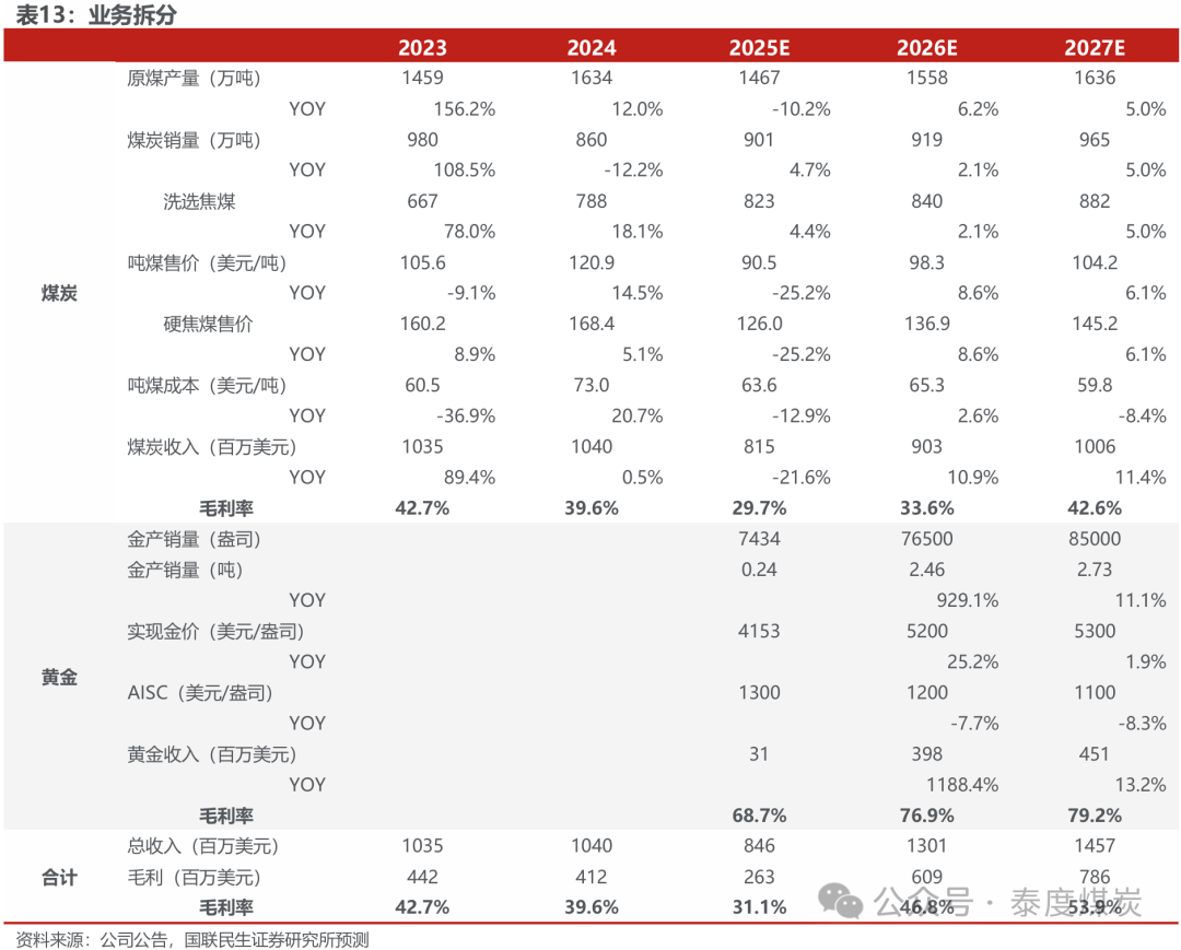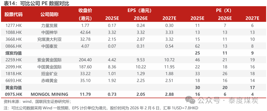 公司是蒙古焦煤龙头企业,股东配景康健,频年布局有色金属,已渐渐发展为抽象矿企。公司煤炭业务运营恰当、成本上风显耀,2026年有望受益煤价核心抬升收尾盈利增长;BKH金矿技俩25Q4投产,2026年爬产将孝顺核心事迹增量,瞻望2026年公司煤炭/黄金分部分歧收尾1.76/0.97亿好意思元归母净利润。