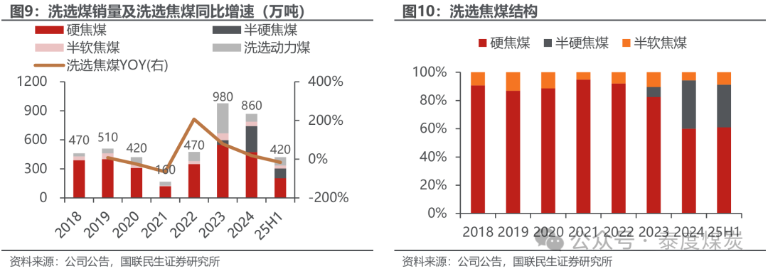 焦煤洗出率抓续提高,销量同步增长。2018-2023年,公司焦煤洗出率保抓在46%-50%区间,2023年下半年启动,公司对原煤加工及配煤设施进行策略调养,以提高洗选焦煤产量,从而2024年焦煤洗出率由47.9%提高至54.7%,2025年已达到58.4%。跟随洗出率的提高,公司洗选焦煤销量同步增长,2024-2025年分歧收尾788/822万吨,同比+18.1%/+4.3%,其中25Q1-Q4销量逐季提高。洗选焦煤结构方面,频年半硬焦煤占比有所提高。公司加大洗选焦煤销售,不仅不错保障更高的收尾价钱,同期因洗煤分量轻于原煤可神圣输送成本,在特准权使用费率和升值税退税方面也有裁汰。
