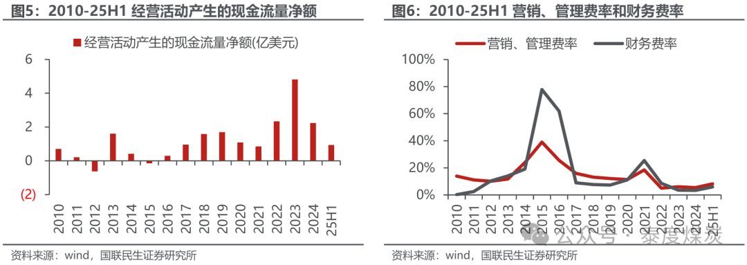 频年操办行动现款流量净额同比下降。跟随公司销量于2023年达到频年峰值,公司操办行动现款流量净额大幅增长至4.82亿好意思元,2024/25H1则分歧收尾2.23/0.93亿好意思元,同比-53.6%/-41.6%。