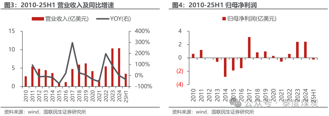 2022年下半年以来:中蒙规复通关,营收与利润显耀增长,25H1盈利承压。自2022年下半年起,跟随港口通关常态化,加之2023-2024年中国钢铁需求回升、焦煤入口量及蒙古焦煤阛阓份额加多,公司产销和事迹均出现大幅增长。2025年上半年,焦煤价钱大幅下落,公司销售收入降幅雄壮于成本,肖似财务成本增长以及债务再融资带来一次性亏空约2504.9万好意思元,录得亏空2332.3万好意思元。