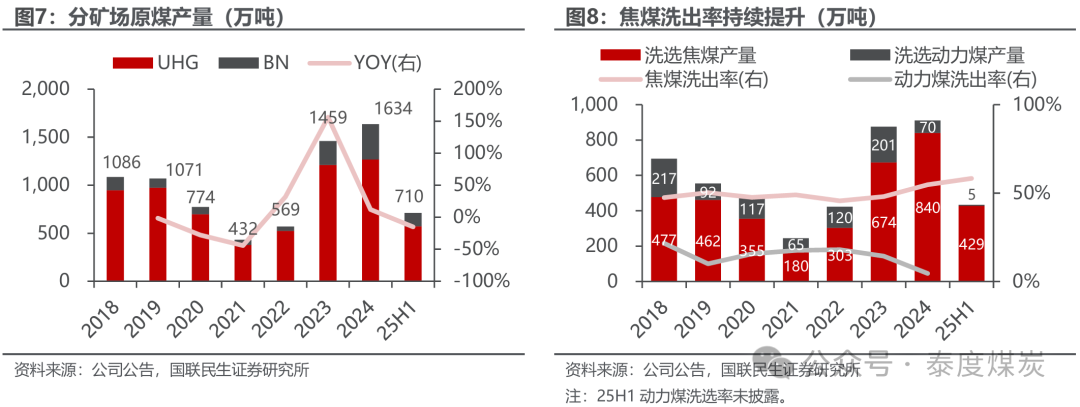 原煤产量疫后规复。公司煤炭产量主要由UHG矿孝顺,2023年起BN矿渐渐放量、25H1原煤产量占比达到19.7%。2020年11月起,受民众卫惹事件影响,蒙古与中国边境婉曲量及公司坐蓐受限,2021-2022年公司产量抓续低位。2022年下半年起,边境婉曲量渐渐改善,并于22Q4规复至疫情前水平,肖似2023年中国钢铁需求较好、焦煤入口大幅加多,2023年公司产量大幅提高。