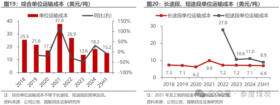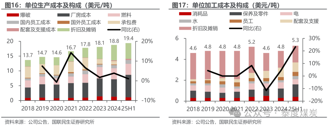 单元加工成本举座波动较小。加工成本主要与原煤处理及洗选厂关联,其中占比较大的为折旧及摊销。2023年因原煤进料量同比增长,吨煤折旧摊销大幅下降,加工成本降至4.6好意思元/吨;25H1,因重视及零件、配套及支援成本加多较多,单元加工成本同比增长23.3%至5.3好意思元/吨。