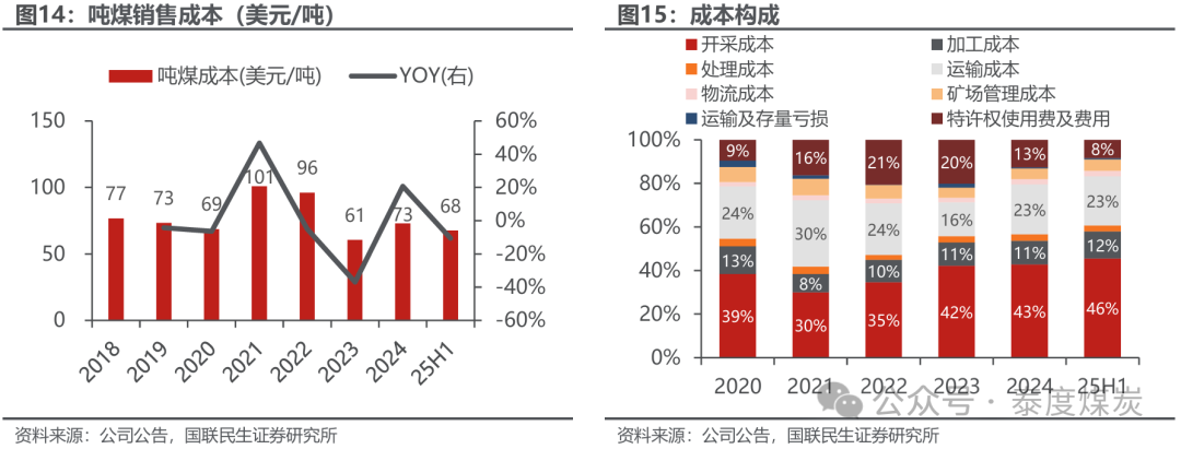 频年吨煤成本受洗选率提高影响核心上移,开采成本占比略有提高。公司吨煤成本自港口通关规复后大幅下降,2024年因洗选焦煤洗出率提高导致销量同比下降,从而分担至吨煤的成本同比抬升,25H1收尾67.6好意思元/吨,同比下降10.6%。成本组成中,开采成本、输送成本、加工成本和特准权使用费及用度占比较高,25H1分歧为46%/23%/12%/8%,共计占比89%。
