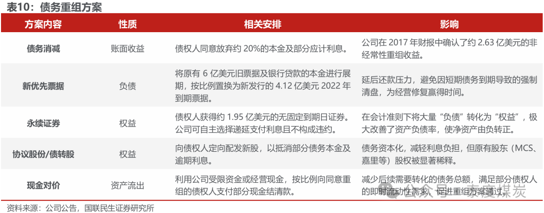 2016年11月-2017岁首:重组决策细化,债权东谈主达成共鸣。2017岁首,公司与债权东谈主小组达成最终重组决策,其核心逻辑是将宿债权的本金及应计利息改革为由现款、新债权、永续证券及股权组成的抽象对价。其中,债务占比最高、于2017年到期的本金为6亿好意思元、年利率8.875%的优先单子置换为新刊行的4.12亿好意思元、年利率5%-8%的2022年到期单子,公司还款压力大幅下降。