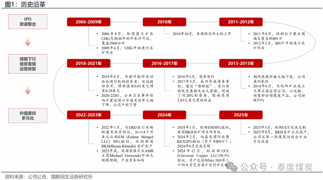 Ø 掘金期间——为收尾业务多元化,2022年公司与Erdene Resource Development Corporation(ERD)鉴定策略定约及投资合同,共同推动Bayan Khundii(BKH)金矿技俩开辟;2024年1月,公司完成对Erdene Mongol LLC(EM)50%股权的收购,获取BKH金矿技俩的扫数权。2024年12月,公司收购Universal Copper LLC(UCC)50.5%股权,其金钱包括White Hill等三个铜及有色金属矿区的开采权,于2025年3月完成交割。2025年9月,BKH金矿矜重投产,公司从单一焦煤商向抽象矿业巨头迈进。