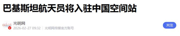 巴基斯坦航天员将入驻中国空间站.光明网.2026-02-27 09:32.