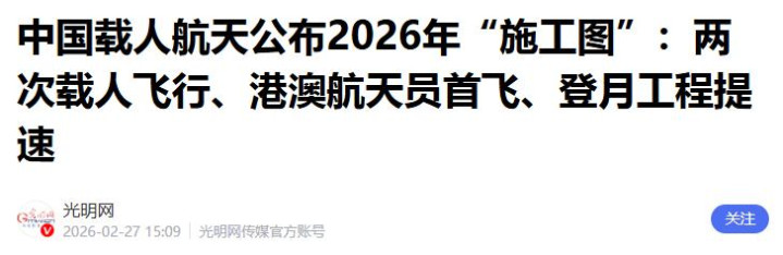 中国载东谈主航天公布2026年“施工图”:两次载东谈主飘零、港澳航天员首飞、登月工程提速.光明网.2026-02-27 15:091.