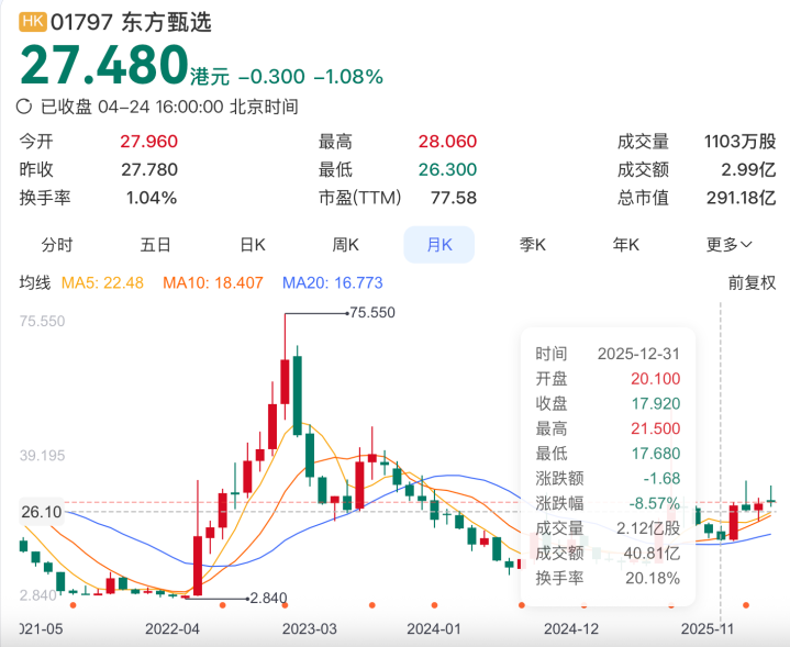 岁首于今牛牛,东方甄选股价由17.92港元涨至上个交游日的27.48港元,涨53.3%。