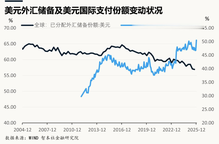 环球银行金融电信协会(SWIFT)发布的数据剖析:2025年12月好意思元在国际往复中的占比达50.5%,较11月的46.8%大幅跃升,为2023年以来最高水平;欧元、英镑的支付份额分离降至21.9%、6.73%;东说念主民币滑至第六位,其支付份额小幅降至2.73%。
