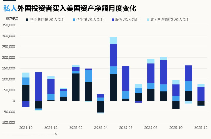 国际私东说念主投资者是增握好意思元钞票的完全主力军。2025年,国际私东说念主投资者净买入好意思国钞票高达13202亿好意思元,高居历史第二,同比大涨超21%。